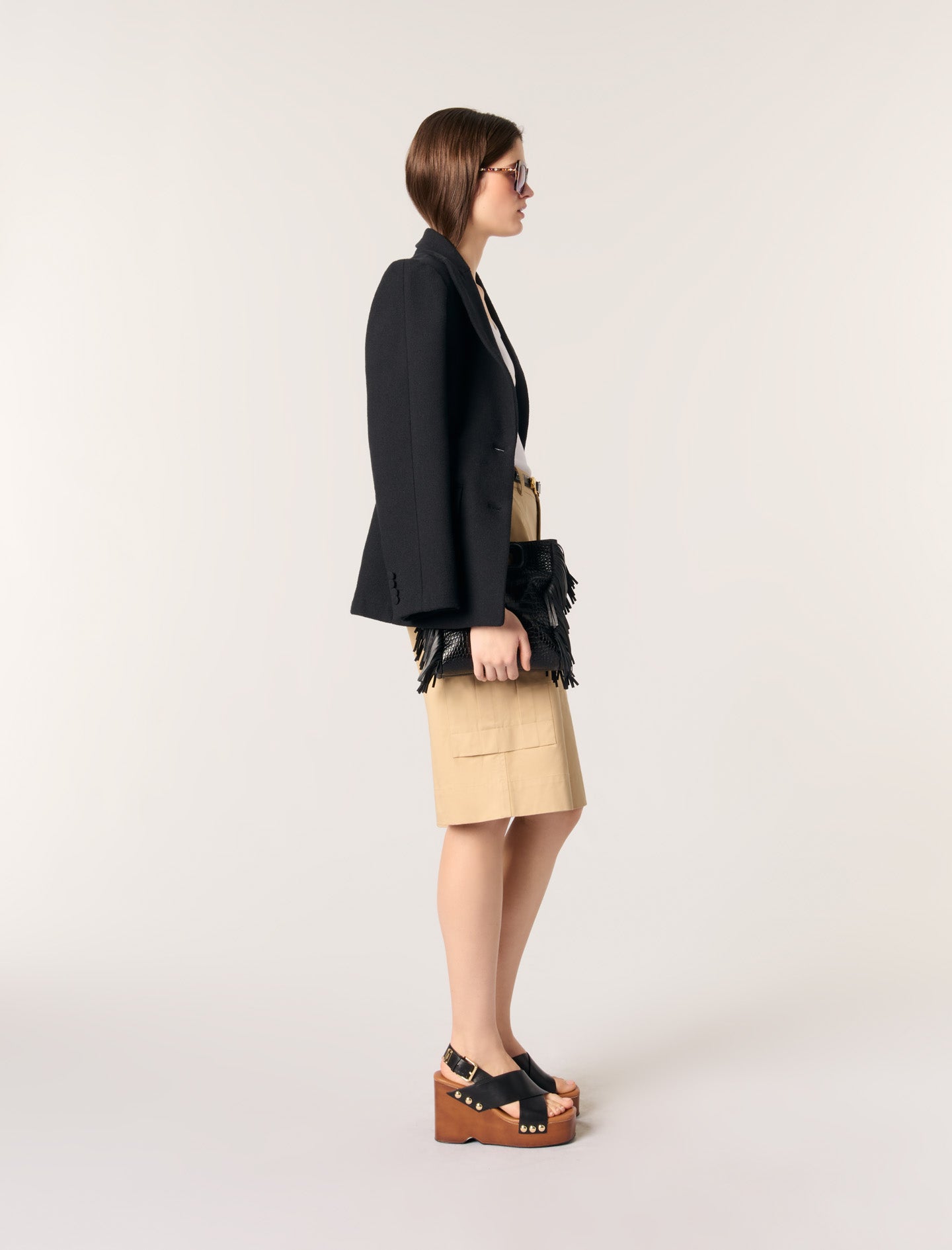 Combínelo con un cinturón, un top, tacones y una chaqueta para lucir un look elegante y natural. En cuanto a los accesorios, opte por gafas de sol, un bolso y sandalias de cuña.