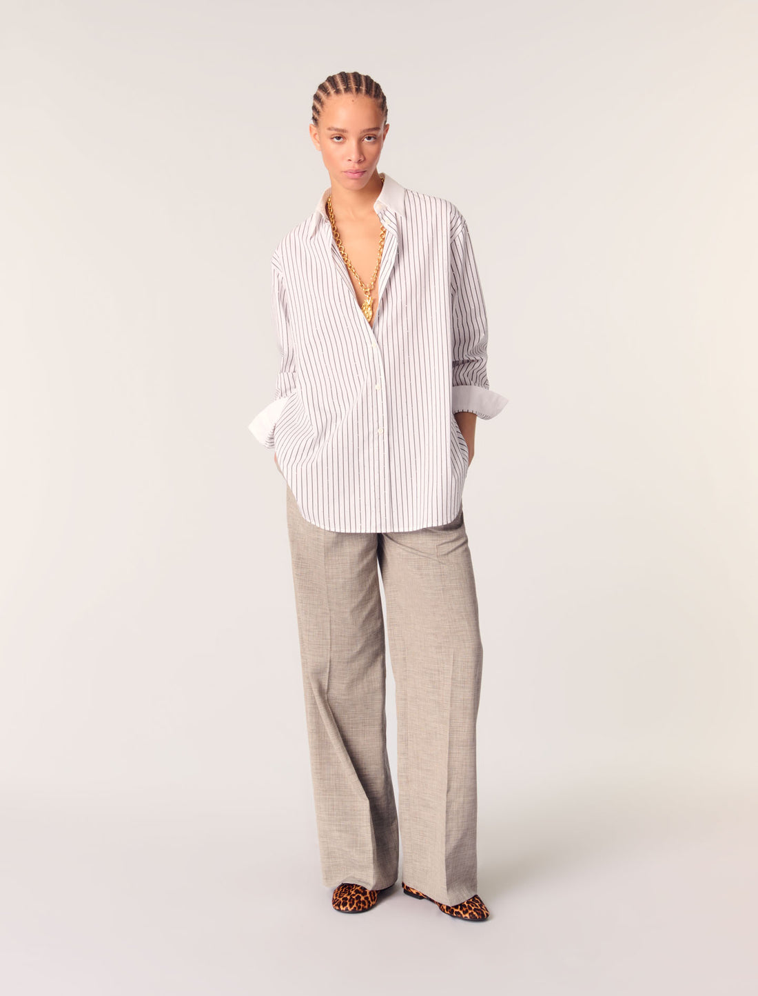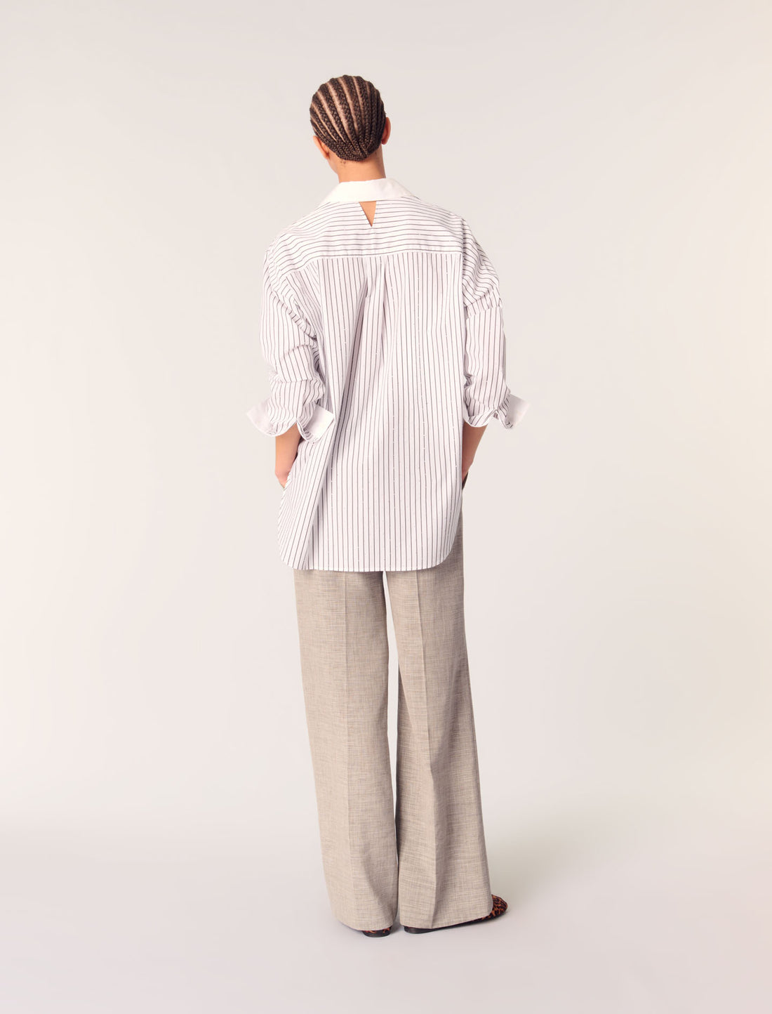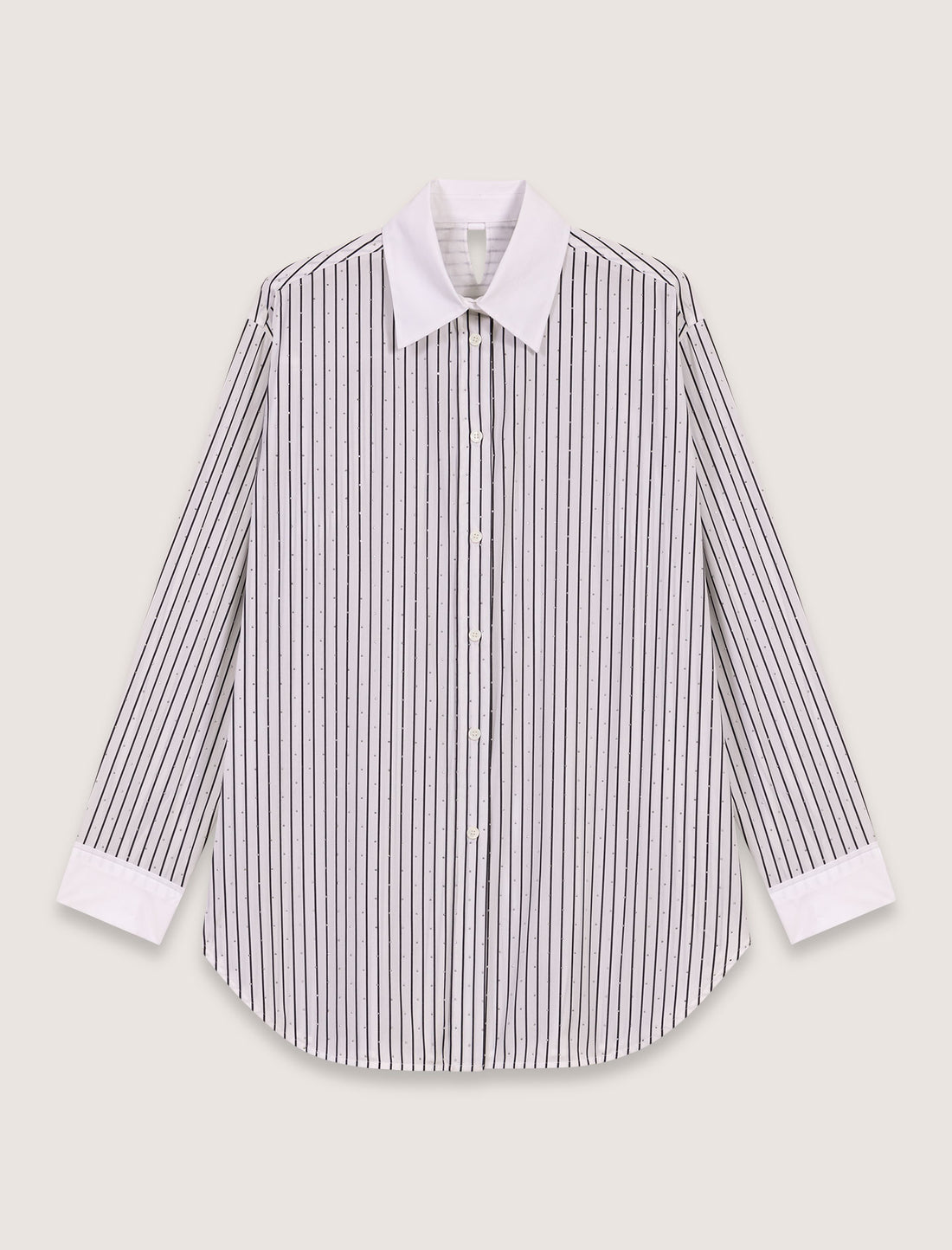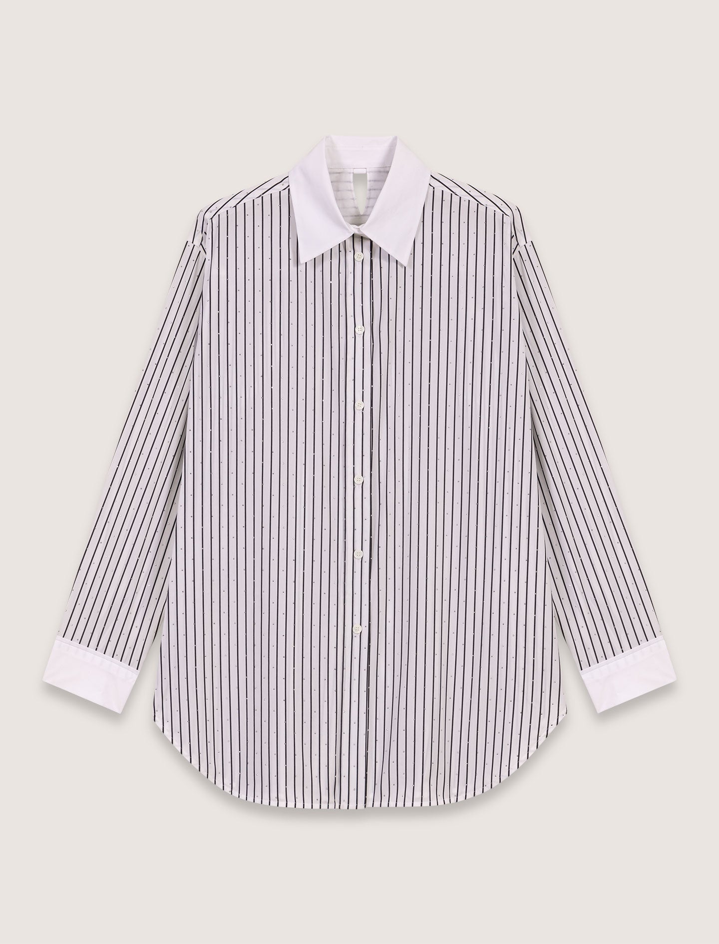 La imprescindible camisa de rayas se reinterpreta con pequeña pedrería all-over. El cuello clásico y los puños lisos con botones realzan el corte largo y oversize. En la espalda se aprecia un pequeño corte en forma de V.