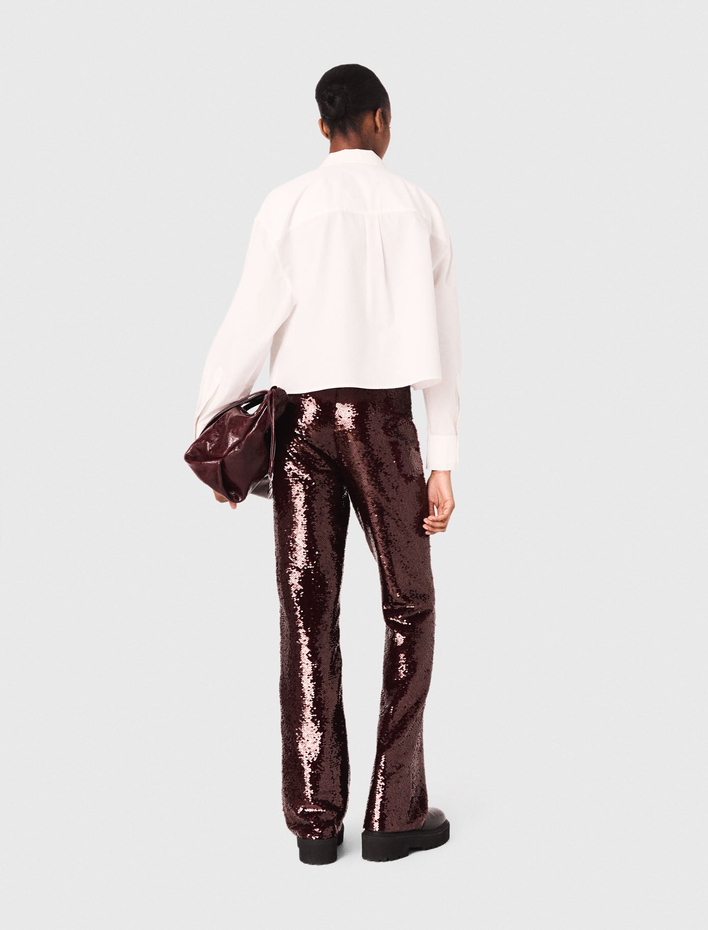 En la continuidad de un armario preppy revisitado, el estudio Maje imagina piezas fuertes, a la vez estructuradas y llenas de carácter. Esta camisa corta de popelina encarna esta visión: una pieza a la vez clásica y con un giro, resaltada por detalles inesperados. El lazo desmontable en la espalda, los puños contrastados a rayas y el pliegue de caja rompen los códigos y afirman un estilo contemporáneo. Para completar el look y aportar un toque de brillo, apueste por un pantalón de lentejuelas y añada un bolso de la firma.