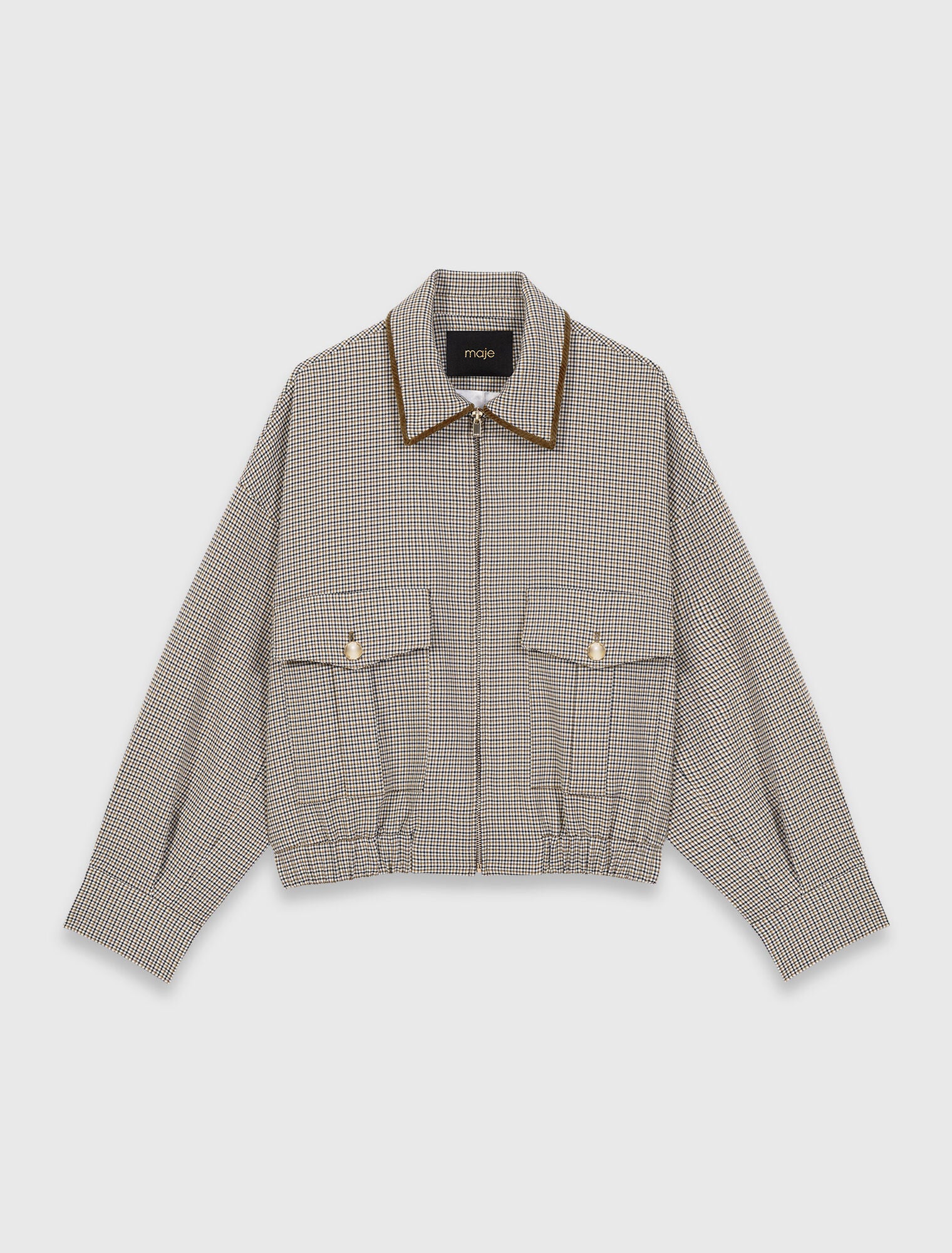Esta cazadora corta y holgada se distingue por su estampado de pata de gallo, un cuello con ribete de pana en contraste y acabados metálicos dorados. Su cintura elástica y sus bolsillos con solapa subrayan un equilibrio perfecto entre estructura y desenfado.