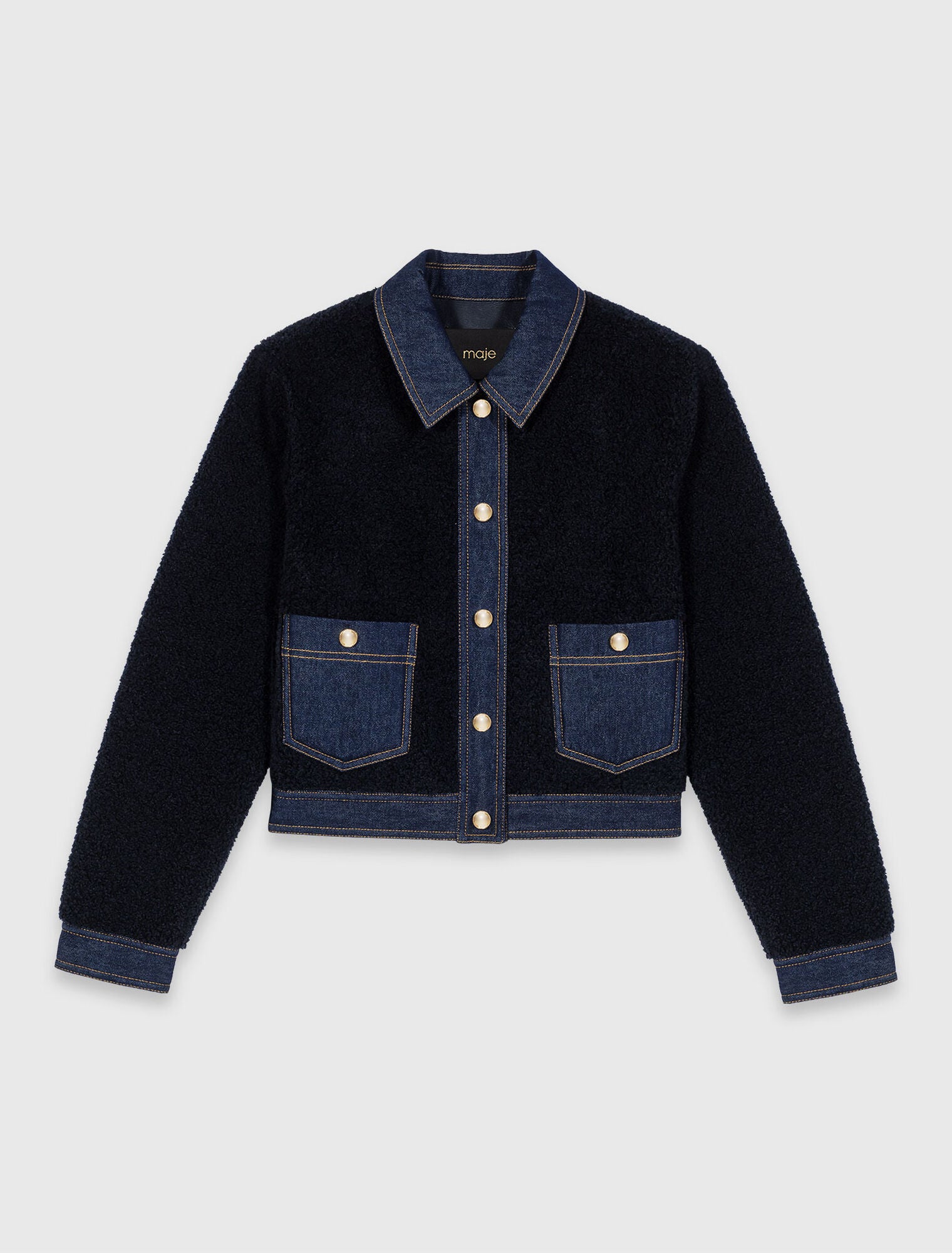 Esta cazadora de corte boxy reinterpreta la chaqueta trucker con un tejido de borreguillo efecto sherpa y acabados en denim azul, realzados con botones de presión dorados y pespuntes camel para un contraste sofisticado.