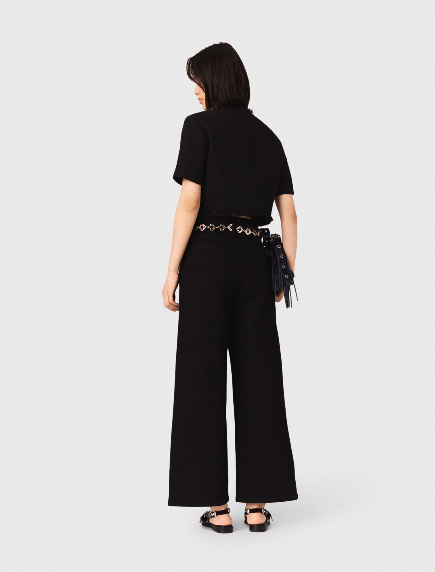 La nueva temporada adquiere un aire urbano y sofisticado con prendas elaboradas en materiales texturizados y cortes definidos. Esta chaqueta corta de tweed bouclé negro seduce por su silueta gráfica, su tacto texturizado y el brillo sutil de sus botones joya adornados con strass. Los acabados con flecos subrayan una modernidad asumida, mientras que los bolsillos con solapa y el corte recto estructuran el conjunto para un look decididamente chic. Combínela con un pantalón de talle alto negro, un cinturón de cadena dorada y un bolso de flecos para componer una silueta fuerte y contemporánea.