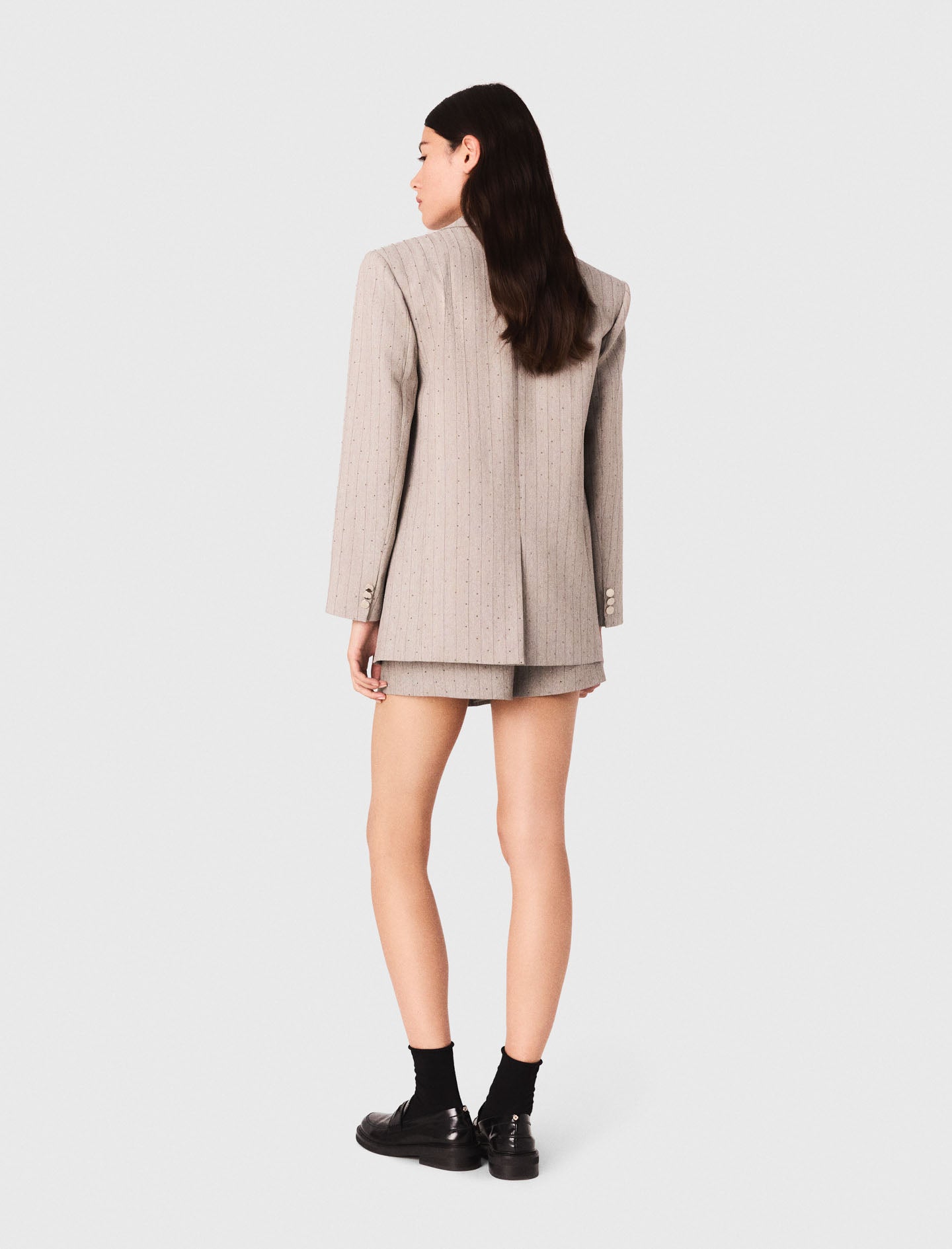 Esta chaqueta estructurada aporta mucho estilo a la silueta y se distingue por sus rayas de strass y acabados cuidados, desde el cuello sastre hasta los puños abotonados.