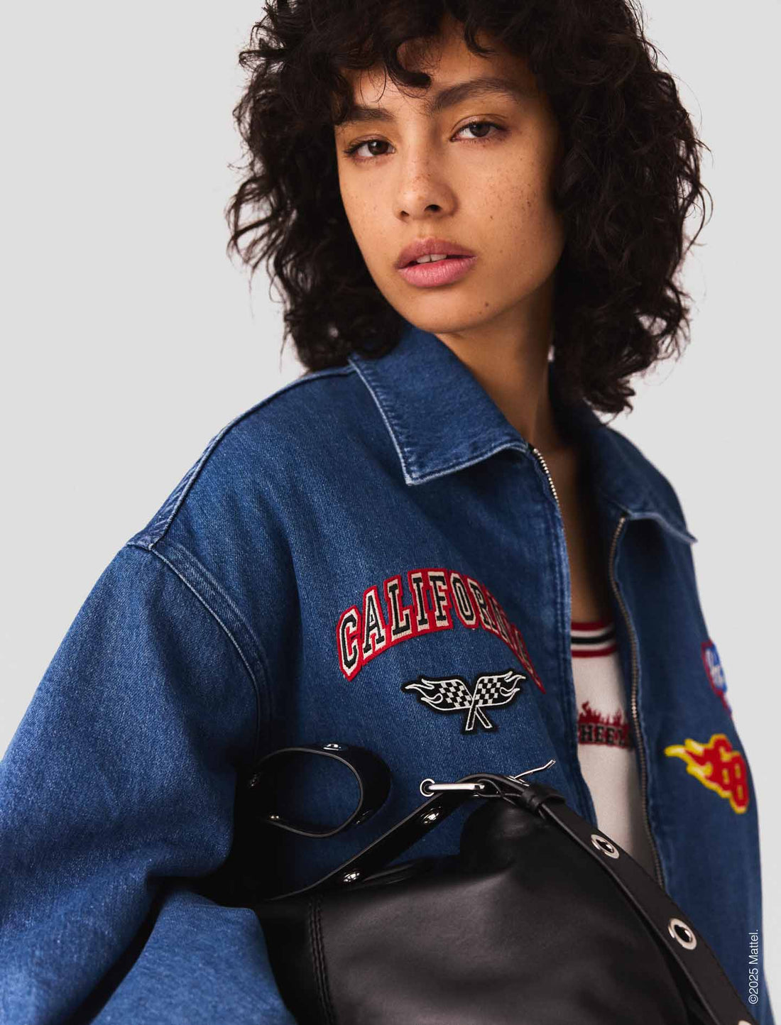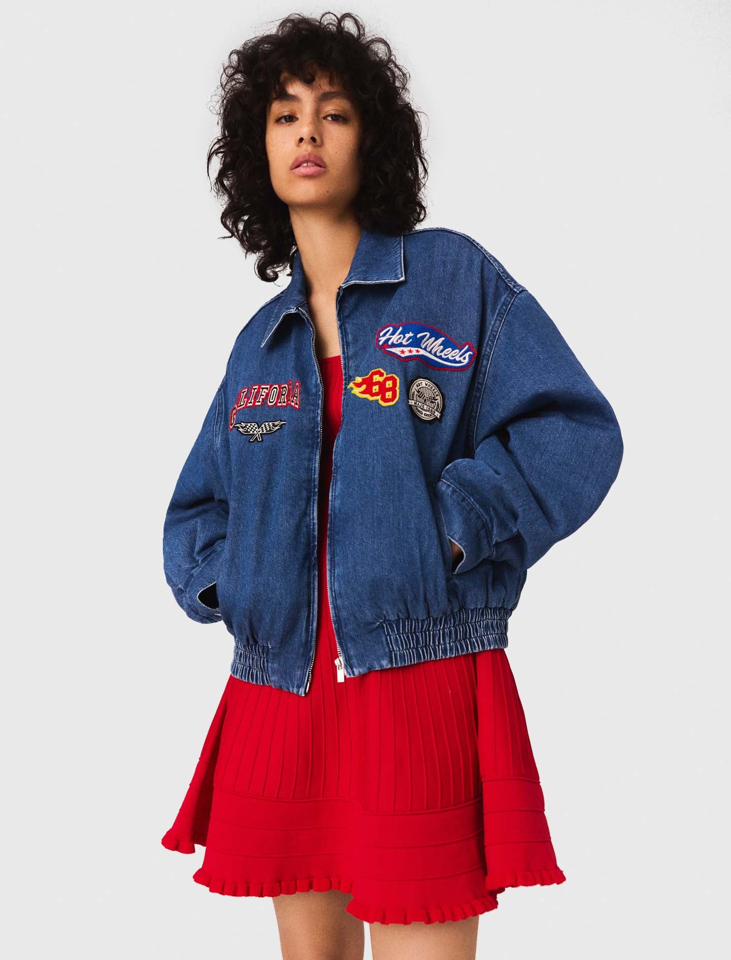 La cazadora oversize se reinventa para esta colaboración inédita. Inspirada en el mundo de las carreras, recoge sus códigos con estilo y lleva parches bordados en la parte delantera.