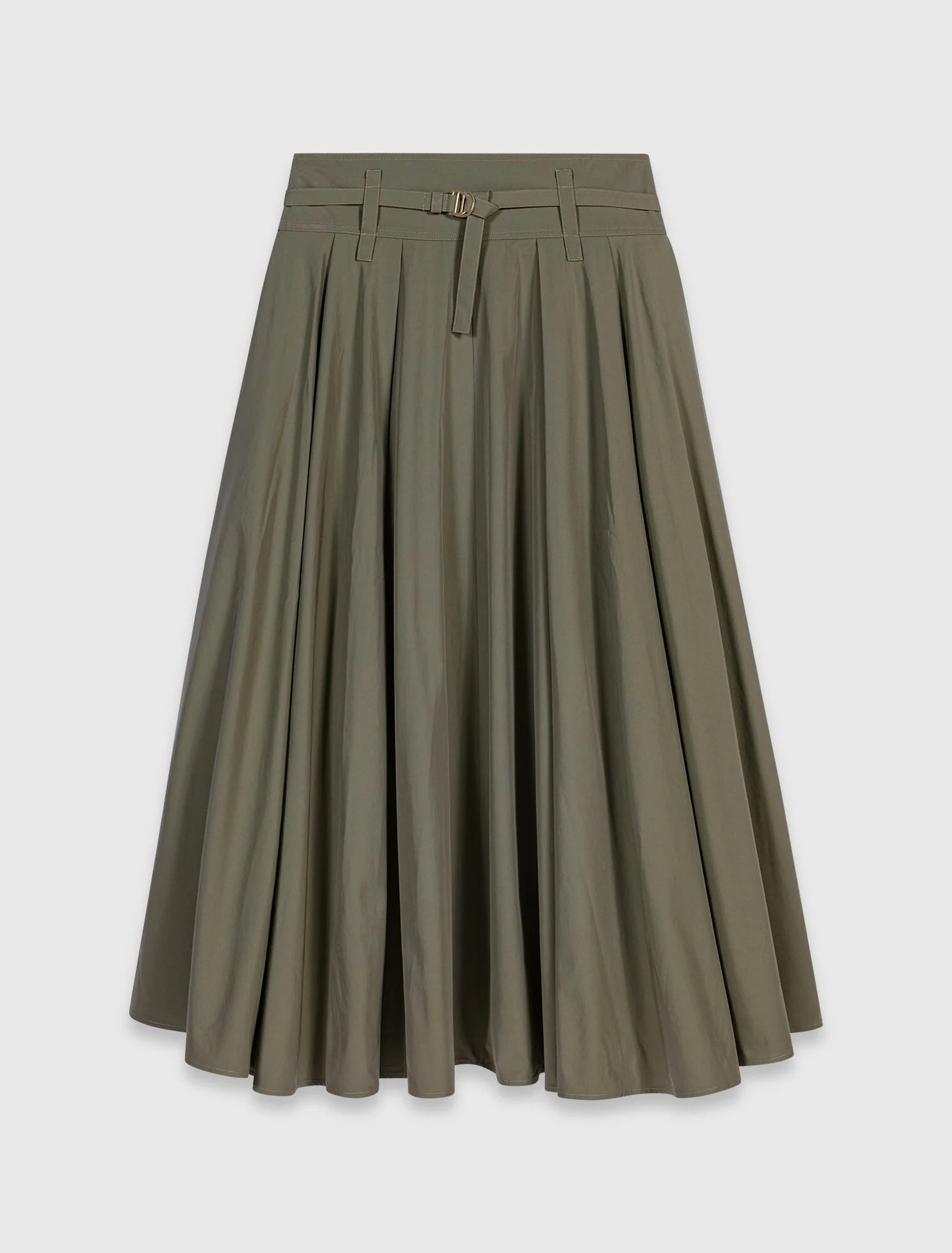 Esta falda midi presenta una silueta acampanada, adornada con pliegues marcados y un cinturón fino con hebilla dorada que estructura la cintura. Los pespuntes en contraste y el cinturón ajustable le confieren un aspecto elegante y contemporáneo a la vez.