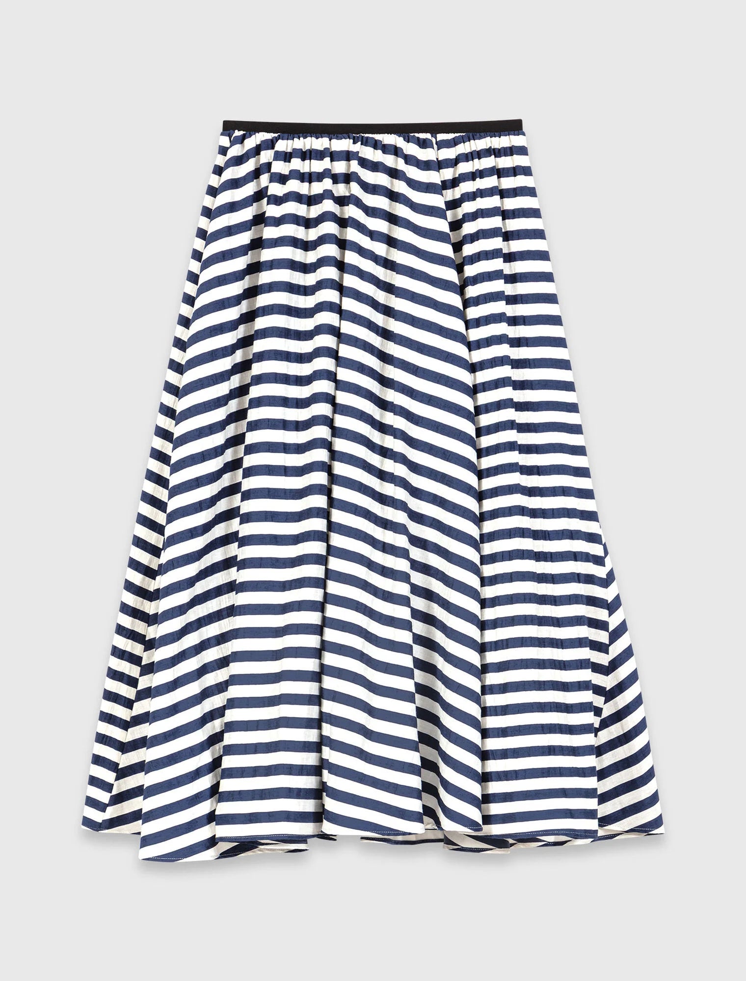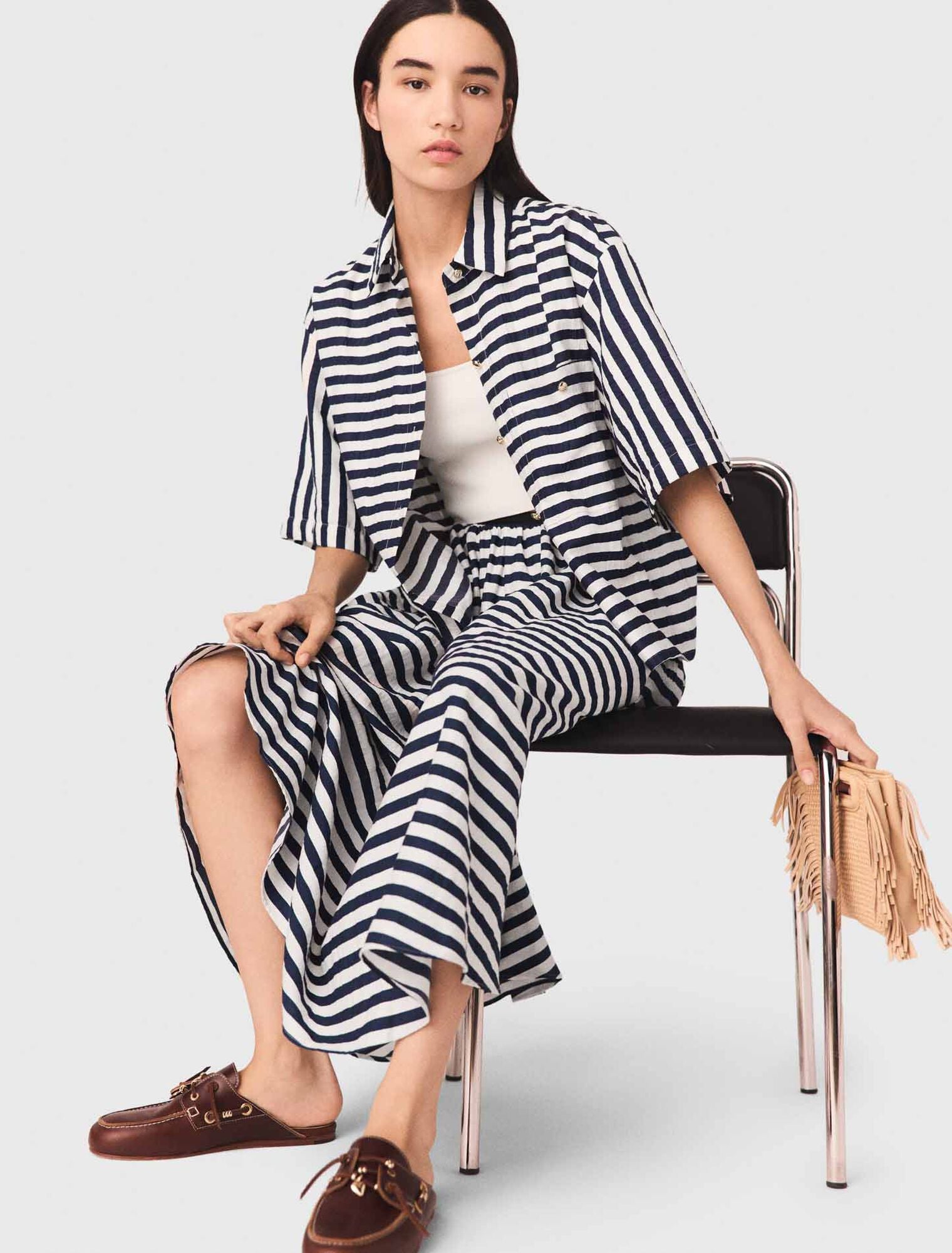 Esta falda larga presenta un corte acampanado y fluido, realzado por anchas rayas azul marino y blanco roto. La textura arrugada de la mezcla de lino y algodón, combinada con una ancha banda elástica negra en la cintura, aporta un toque moderno y gráfico para realzar la caída de la prenda.