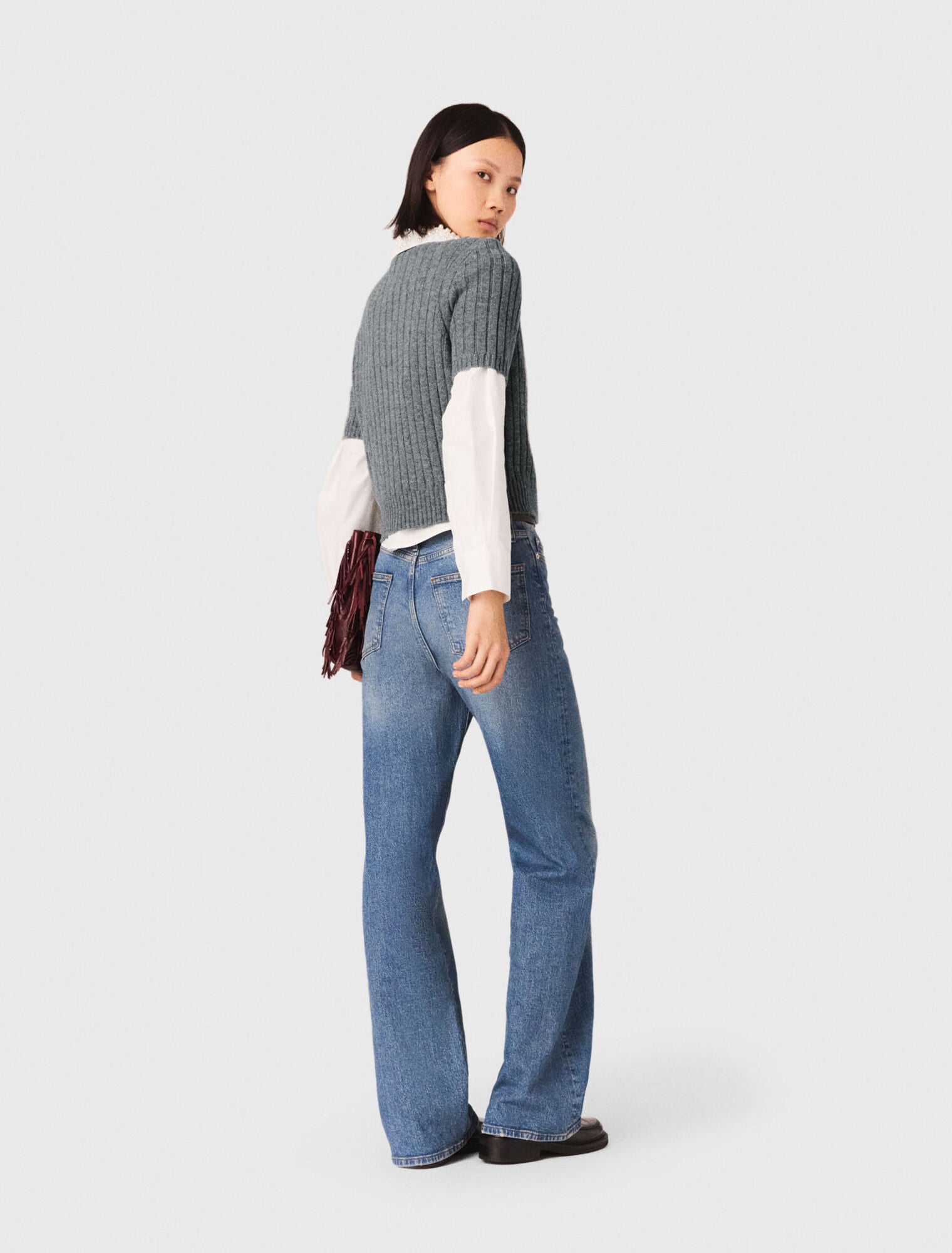 Para reforzar el contraste, combínelo con un vaquero ancho de talle alto, un cinturón de cuero negro, un bolso Miss M burdeos y unos mocasines, o llévelo superpuesto sobre una camisa blanca para un toque gráfico y urbano.