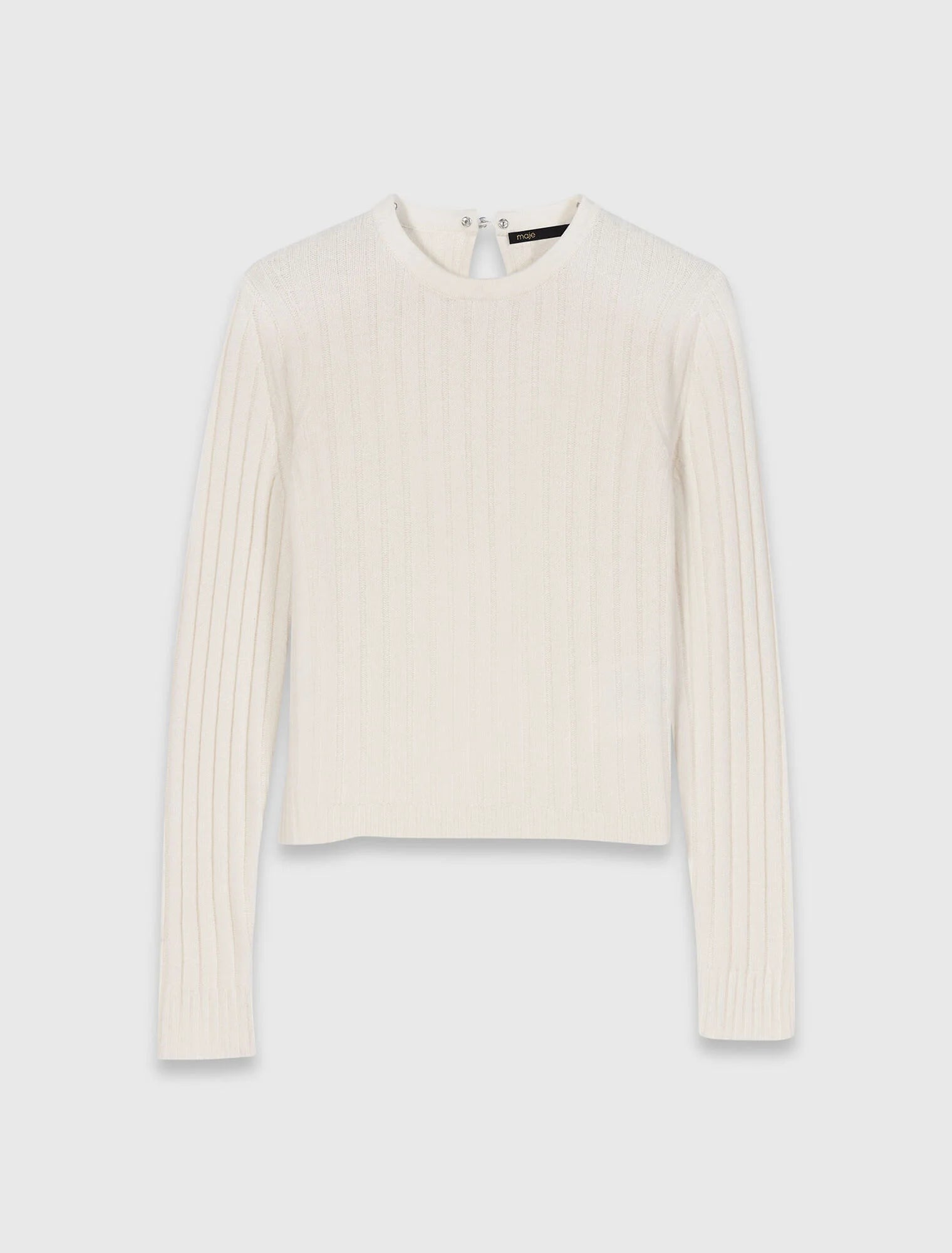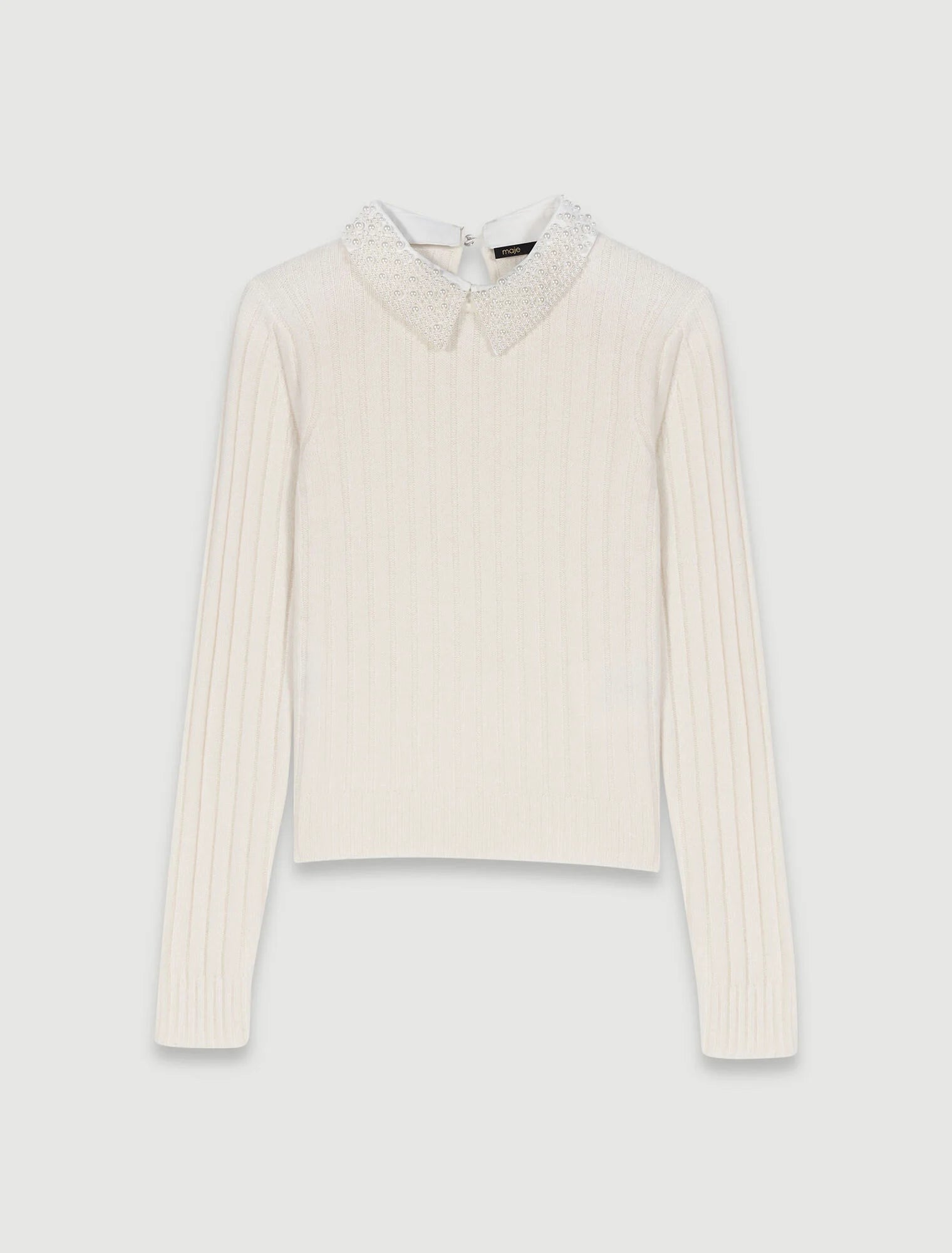 Este jersey corto de punto, ceñido a la silueta, se transforma a lo largo del día gracias a un cuello Peter Pan desmontable, totalmente bordado con perlas nacaradas, o se puede llevar de forma más depurada con un sencillo cuello redondo. Los detalles refinados, como el delicado cierre en la espalda y los acabados de canalé, marcan la diferencia.