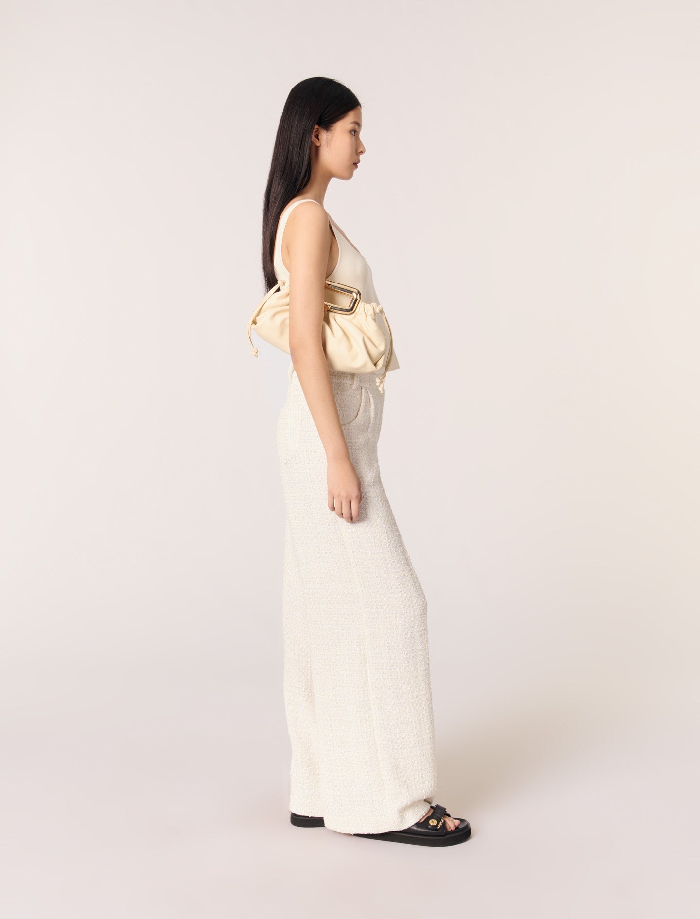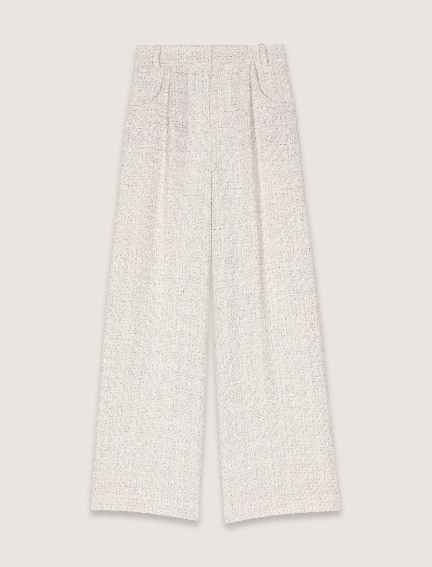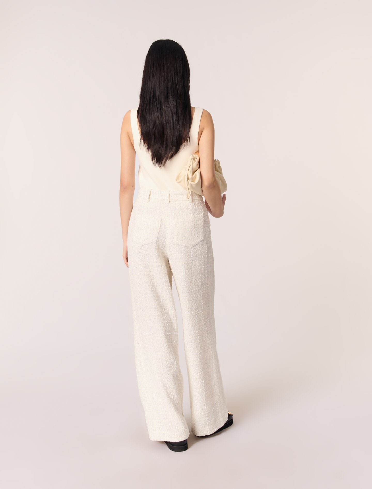 Elaborado con tweed crudo con hilos brillantes, este pantalón tiene un corte ancho y favorecedor. Los pliegues huecos alargan la pierna y aportan fluidez a la silueta. Los dos bolsillos a los lados y en la espalda, discretos y prácticos, completan esta prenda luminosa.