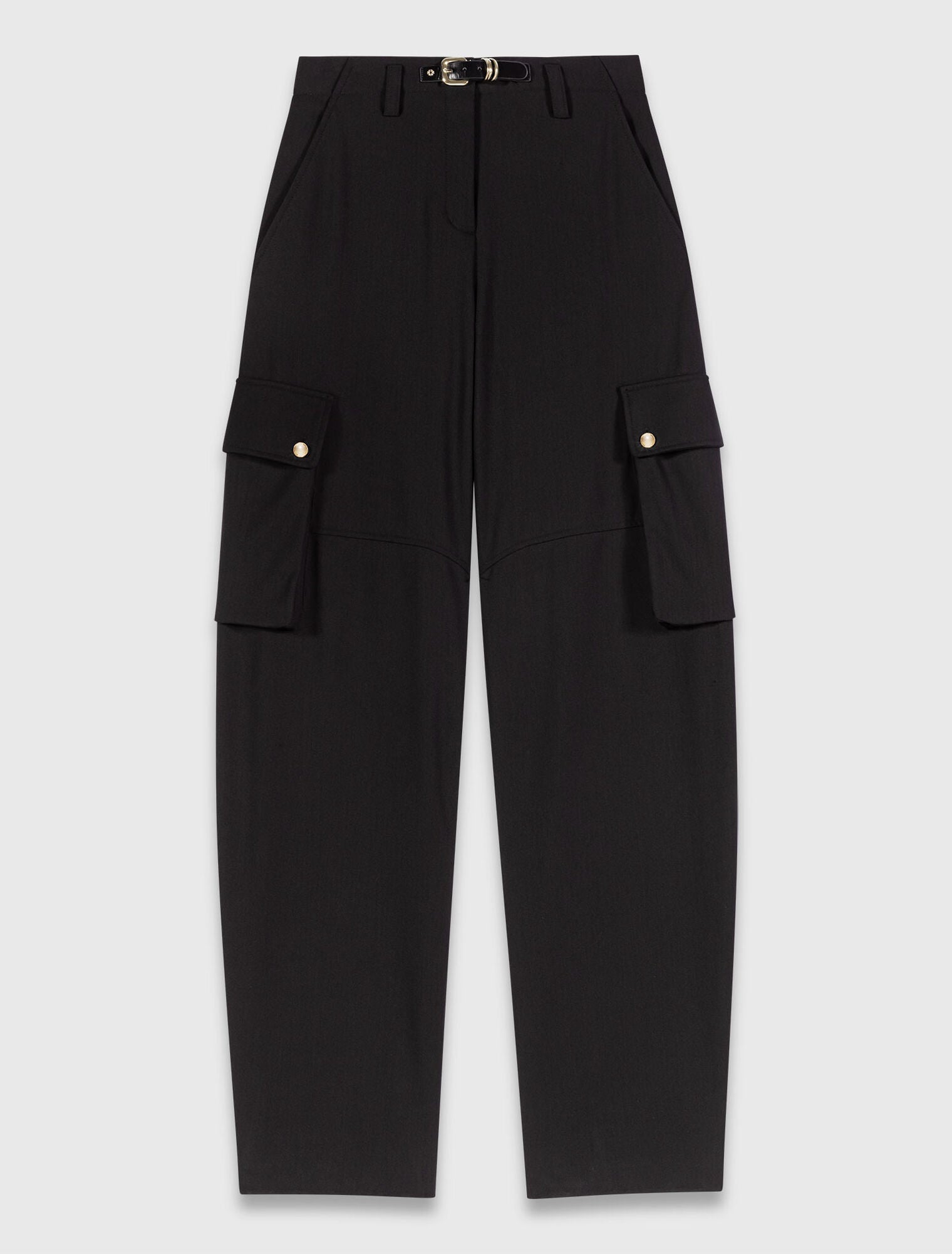 Este pantalón cargo reinterpreta un clásico del armario con materiales elegantes y acabados cuidados. Confeccionado en tejido de lana, se distingue por sus bolsillos cargo laterales con cierre de botón, para un look práctico y estructurado. La cintura se realza con una trabilla y una tira efecto piel con hebilla ajustable, que aportan un toque gráfico y moderno. Llévelo con una chaqueta de manga corta de cuero, unos zapatos de tacón destalonados y un bolso de la firma para para un look urbano y femenino.