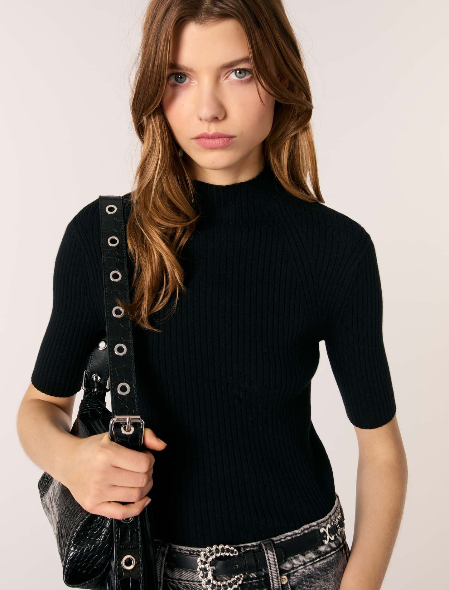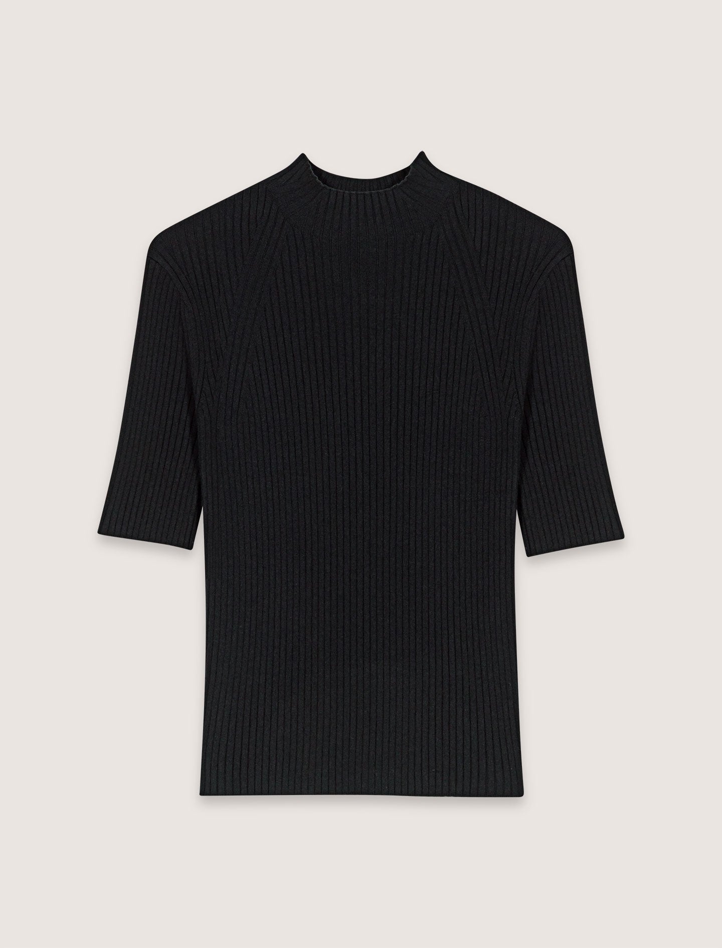 Este jersey de punto de canalé tiene un corte ajustado para conseguir un efecto segunda piel. El cuello alto y las mangas cortas definen un look estructurado, mientras que el pin metálico Clover en la espalda aporta un toque chic.