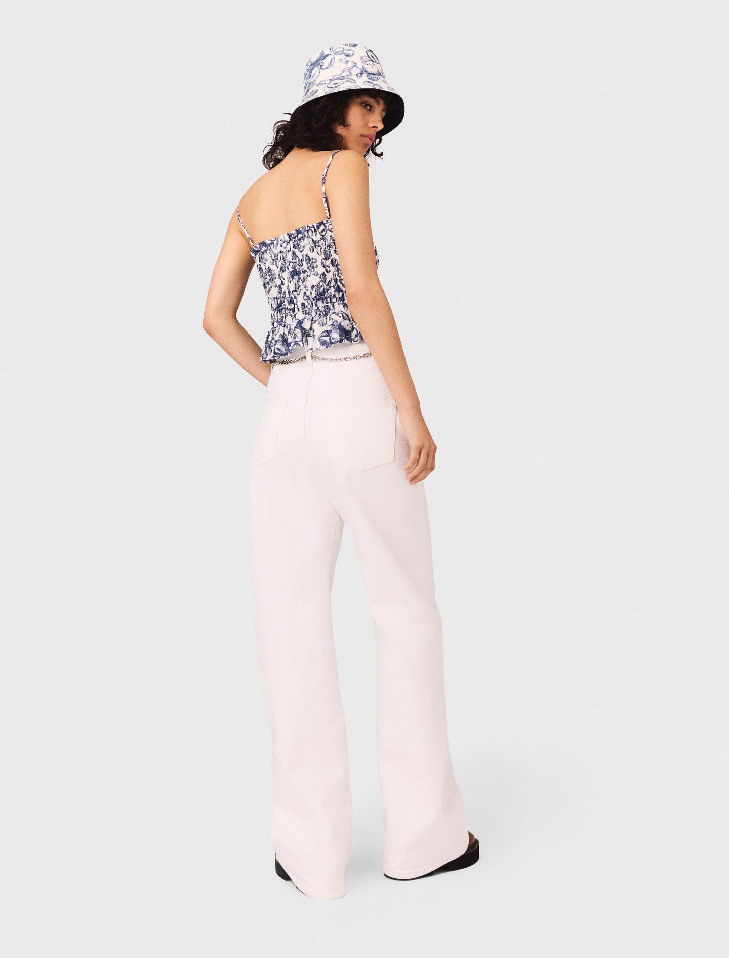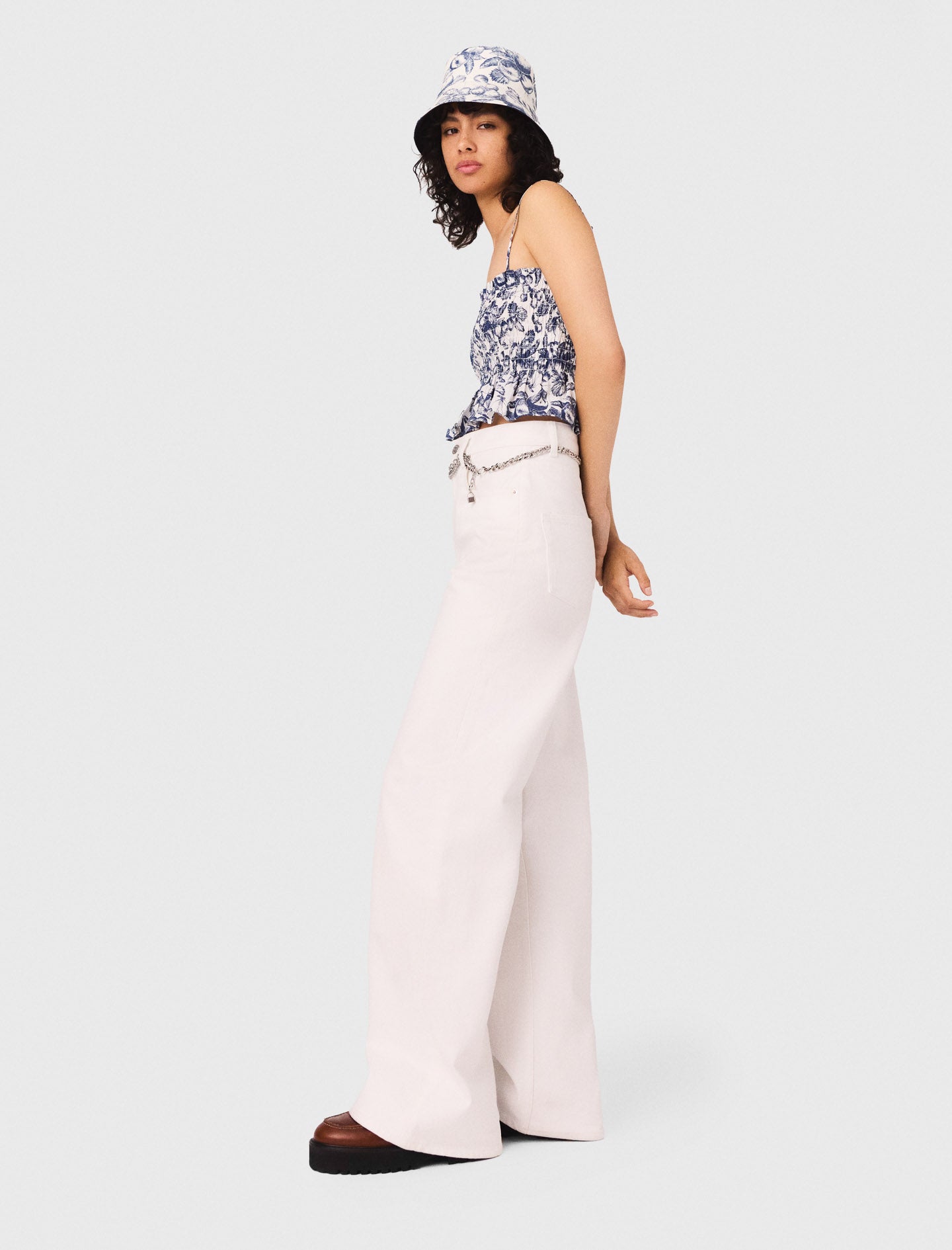 Con su línea recta y su talle medio resaltado por un cinturón de cadena con colgantes desmontable, este vaquero aporta ritmo a la silueta. La etiqueta Clover en la parte trasera firma esta pieza imprescindible de la colección. Añada un top estampado y un gorro bob coordinado para completar el look.