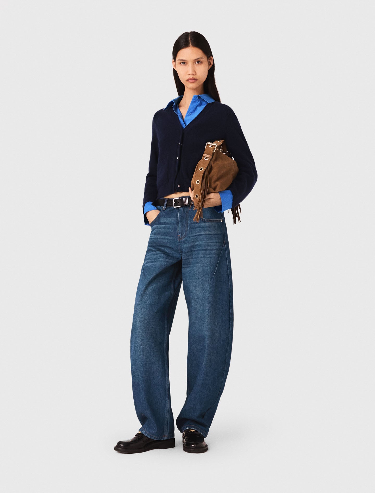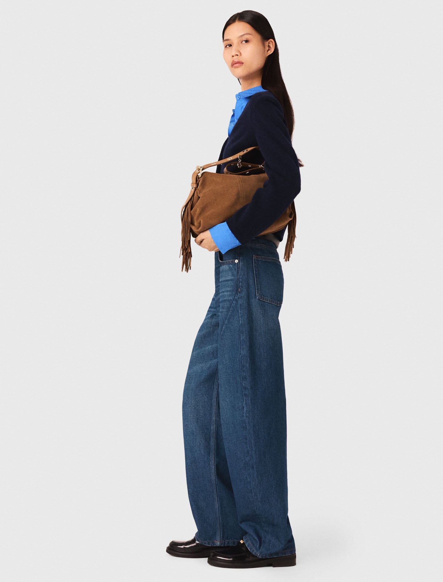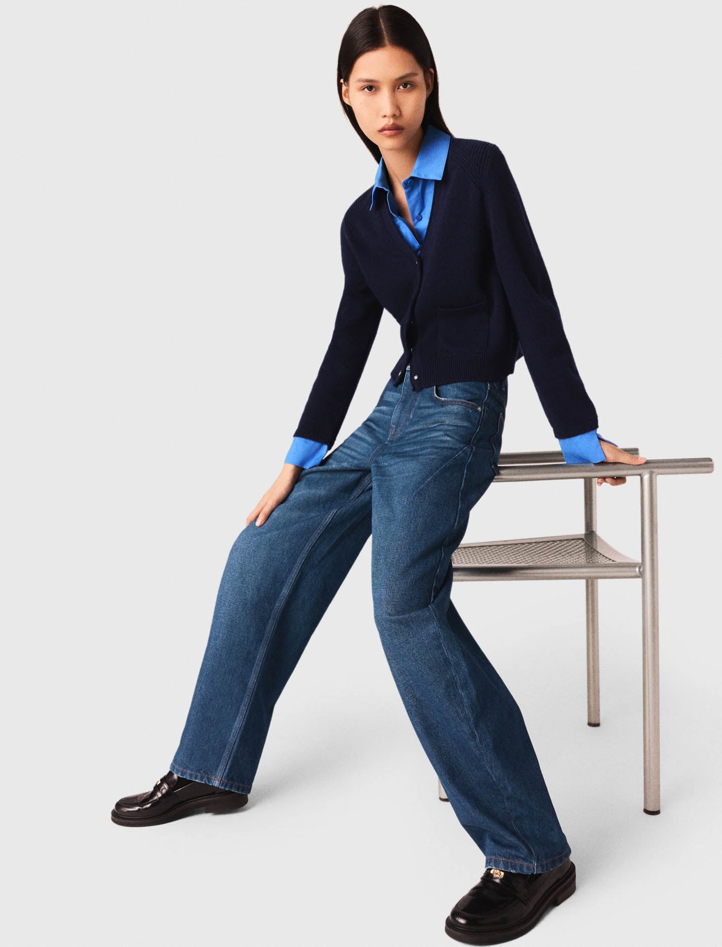 En el corazón de un armario pensado para afrontar la fría temporada con estilo, el denim se impone como un imprescindible en esta nueva colección de Maje. Reinterpretado con un corte globo que moderniza el denim de invierno, el vaquero se convierte en una segunda piel y en un básico para combinar con todas las siluetas. El detalle de la firma: una martingala en la espalda de estilo sartorial, para una silueta ajustada con un toque desenfadado. Añada un cárdigan de punto suave y accesorios de la firma para completar el look: un bolso de ante con flecos, un cinturón de cuero y mocasines brillantes.