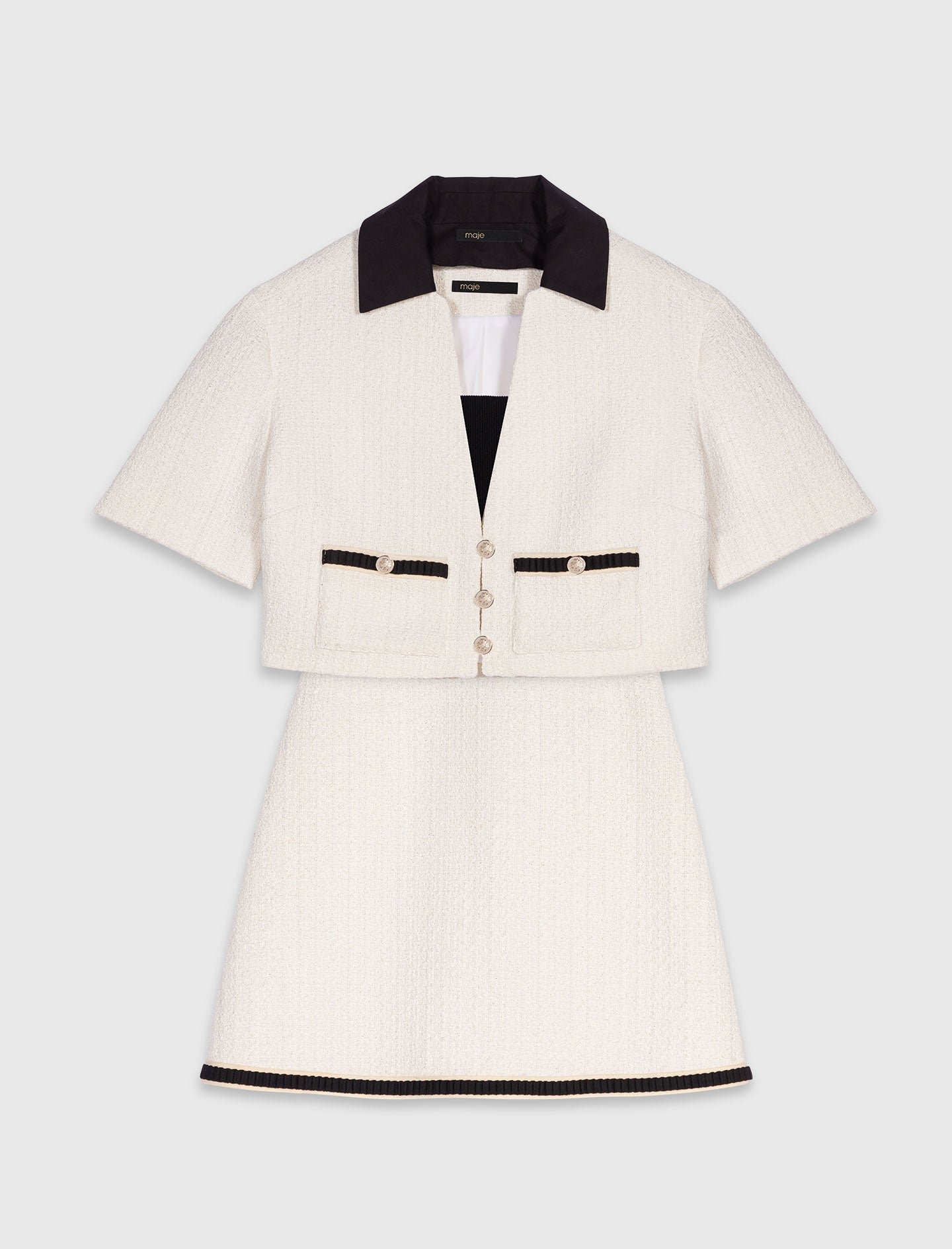 Este vestido 2 en 1 combina un top de punto de canalé y una falda de tweed, y una chaqueta que crea una silueta elegante y contemporánea ofreciendo múltiples posibilidades.