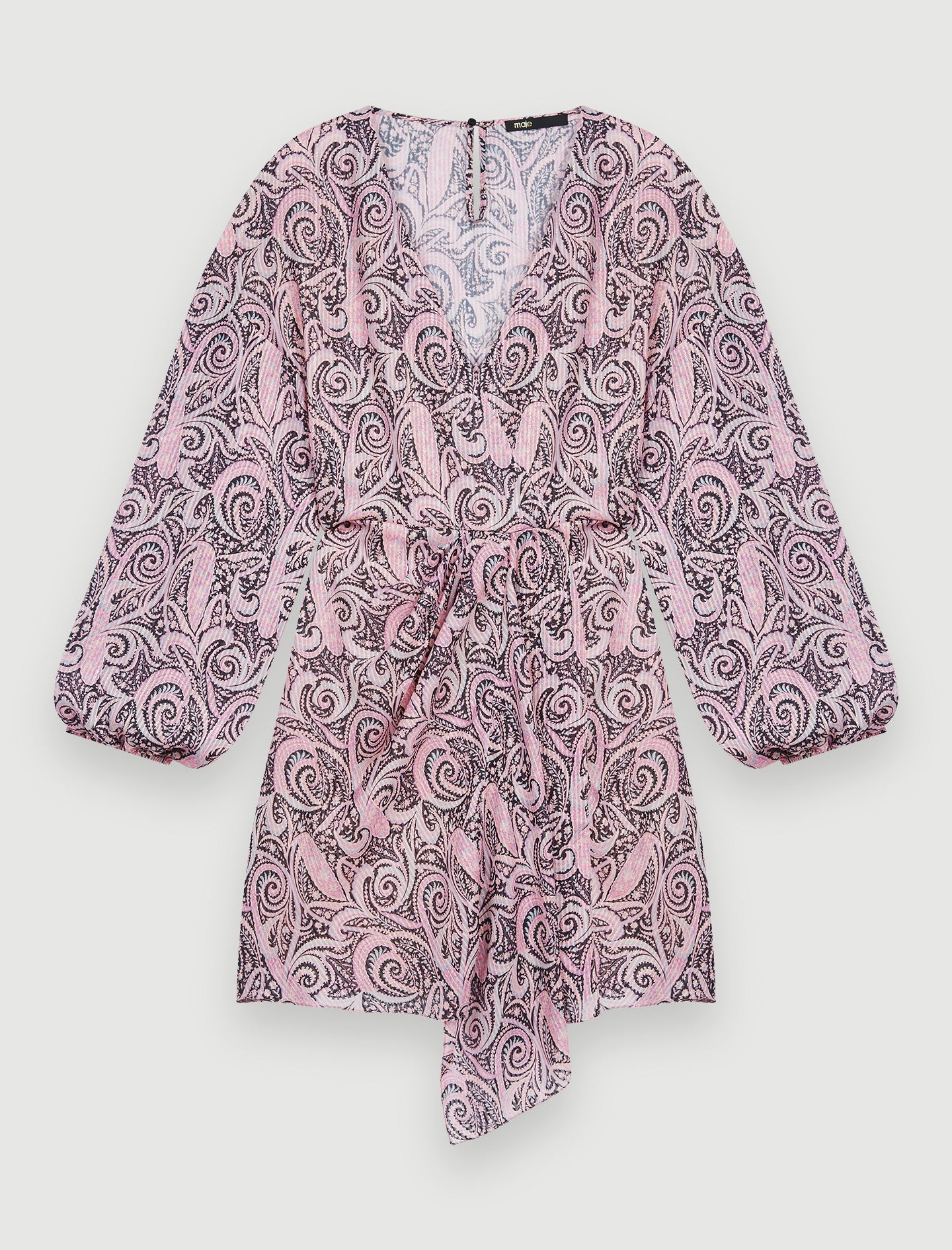 Vestido corto y asimétrico en la parte delantera. Gasa fluida de jacquard ligeramente brillante. Estampado Paisley. Mangas largas y amplias ajustadas en el puño con una goma. Forro de gasa de algodón. Escote de pico. Gota y cierre con botón pequeño en la espalda. Cinturilla elástica. Vestido de ceremonia.