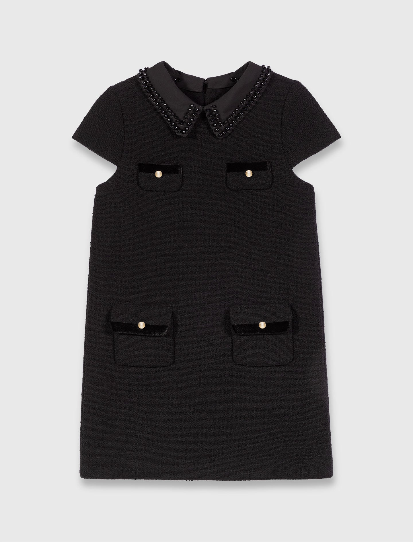 Un estilo de alta costura, anclado en el espíritu parisino. Este vestido corto de tweed juega con los contrastes: línea depurada, tweed texturizado y detalles preciosos. Su cuello joya realzado con perlas aporta un encanto discreto y un bonito brillo, mientras que los acabados de terciopelo en los bolsillos subrayan una elegancia femenina. Un auténtico básico de la temporada.