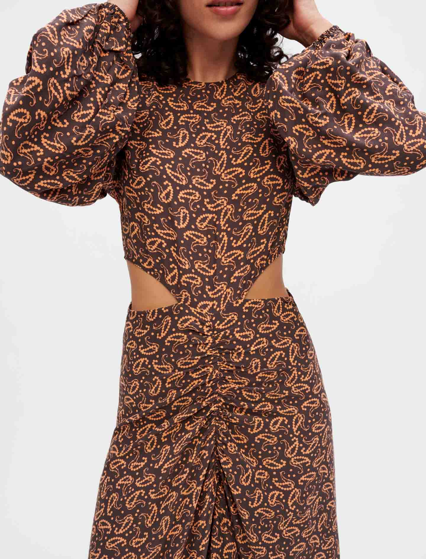 Vestido largo asimétrico y ceñido en la cintura. Viscosa y seda fluida con estampado paisley naranja y marrón. Mangas largas y amplias ajustadas en el puño con un elástico. Forro de viscosa. Cuello redondo. Cremallera invisible en la espalda. Fruncido en la parte delantera y trasera con aberturas en la cintura. Ideal para una ceremonia o salir por la noche.