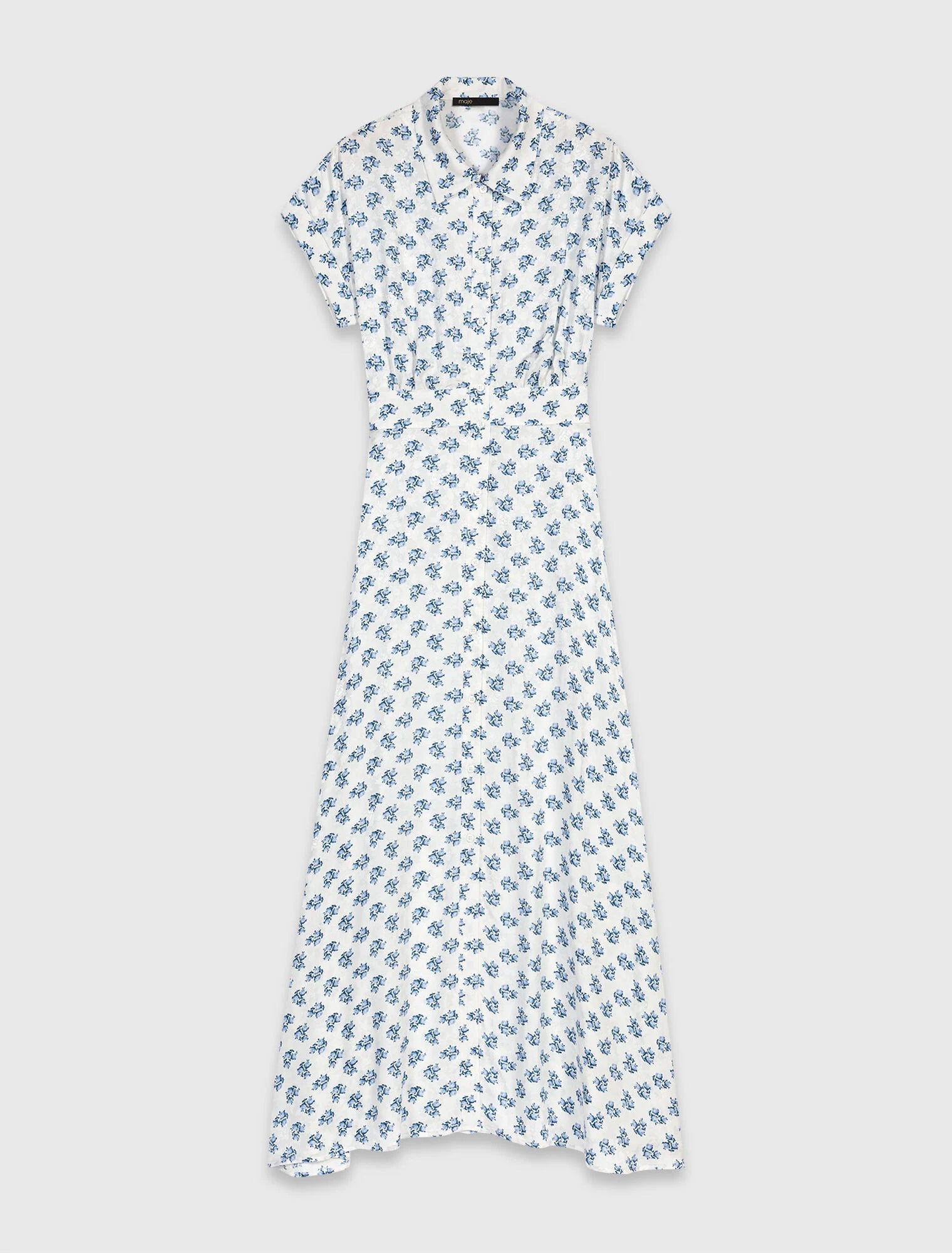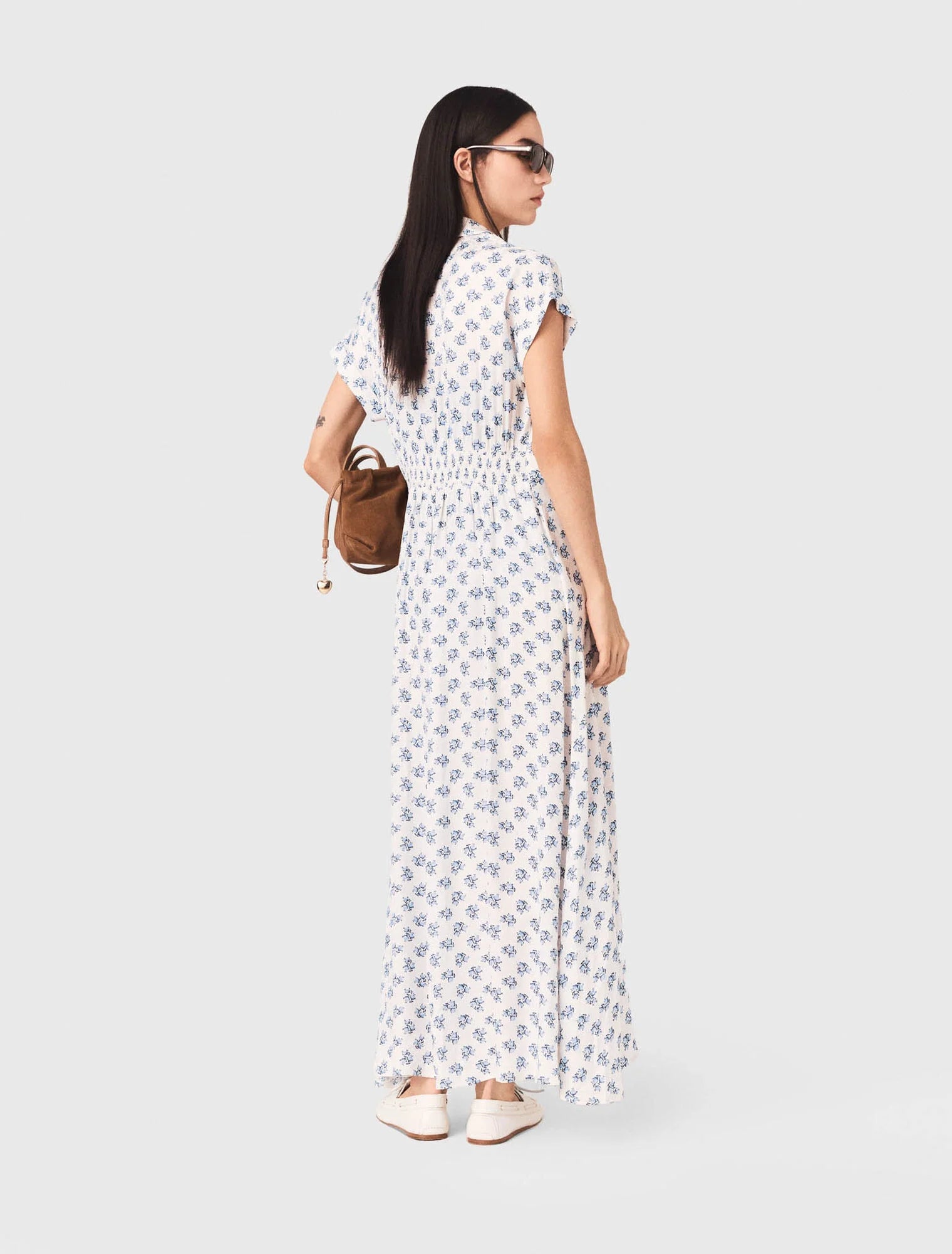 Este vestido largo, fluido y estructurado, seduce por su estampado de ramos de flores azules, su cintura marcada que realza la silueta y la elegancia de sus botones de nácar en una delicada tapeta de botones.