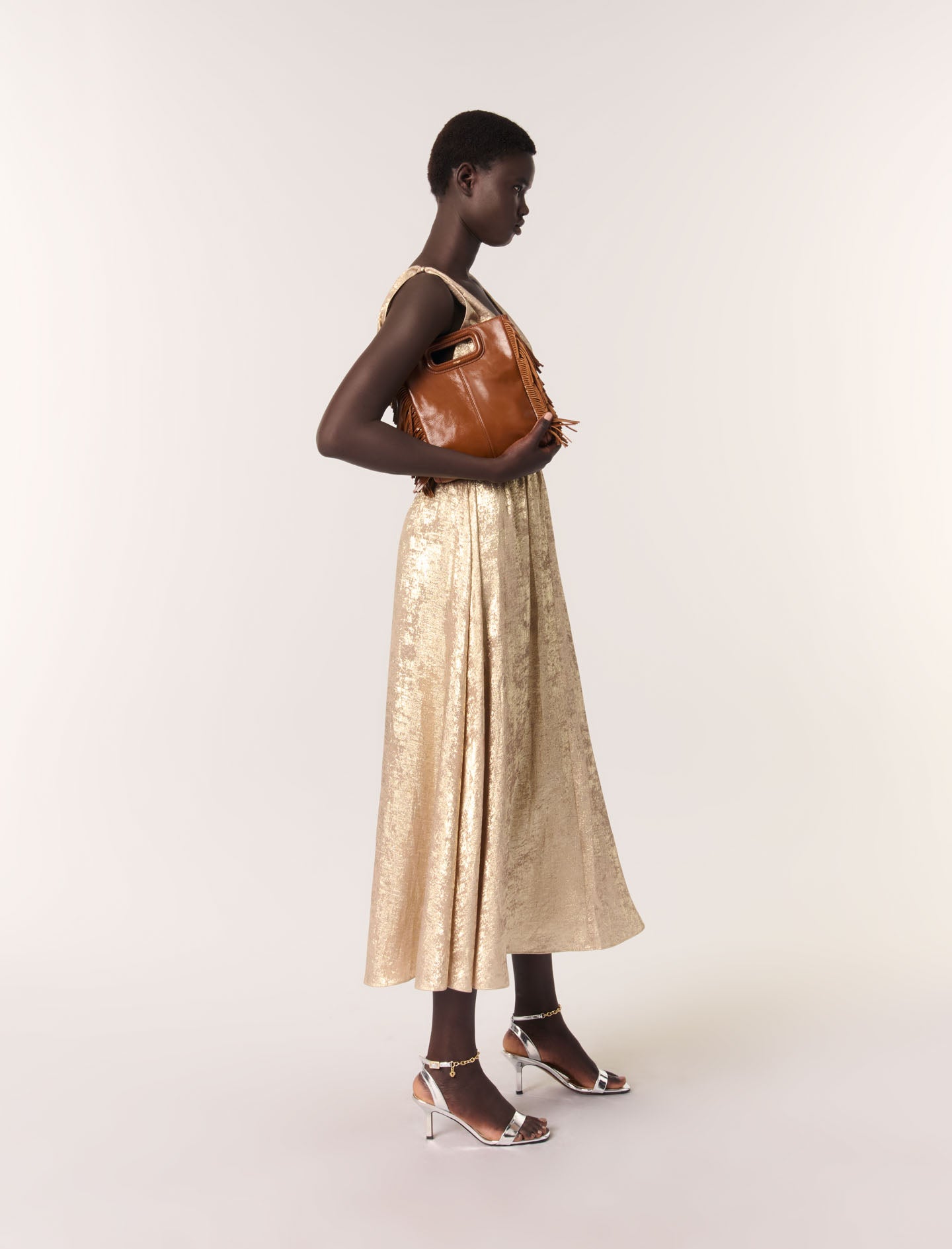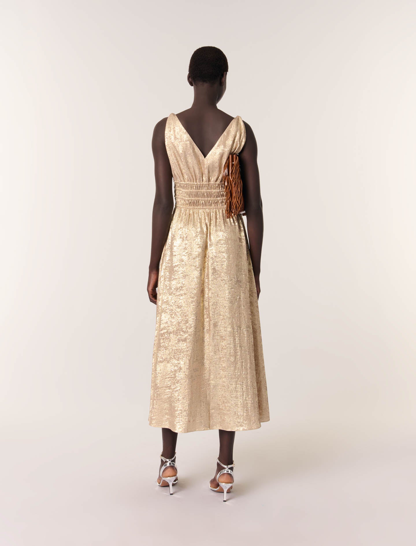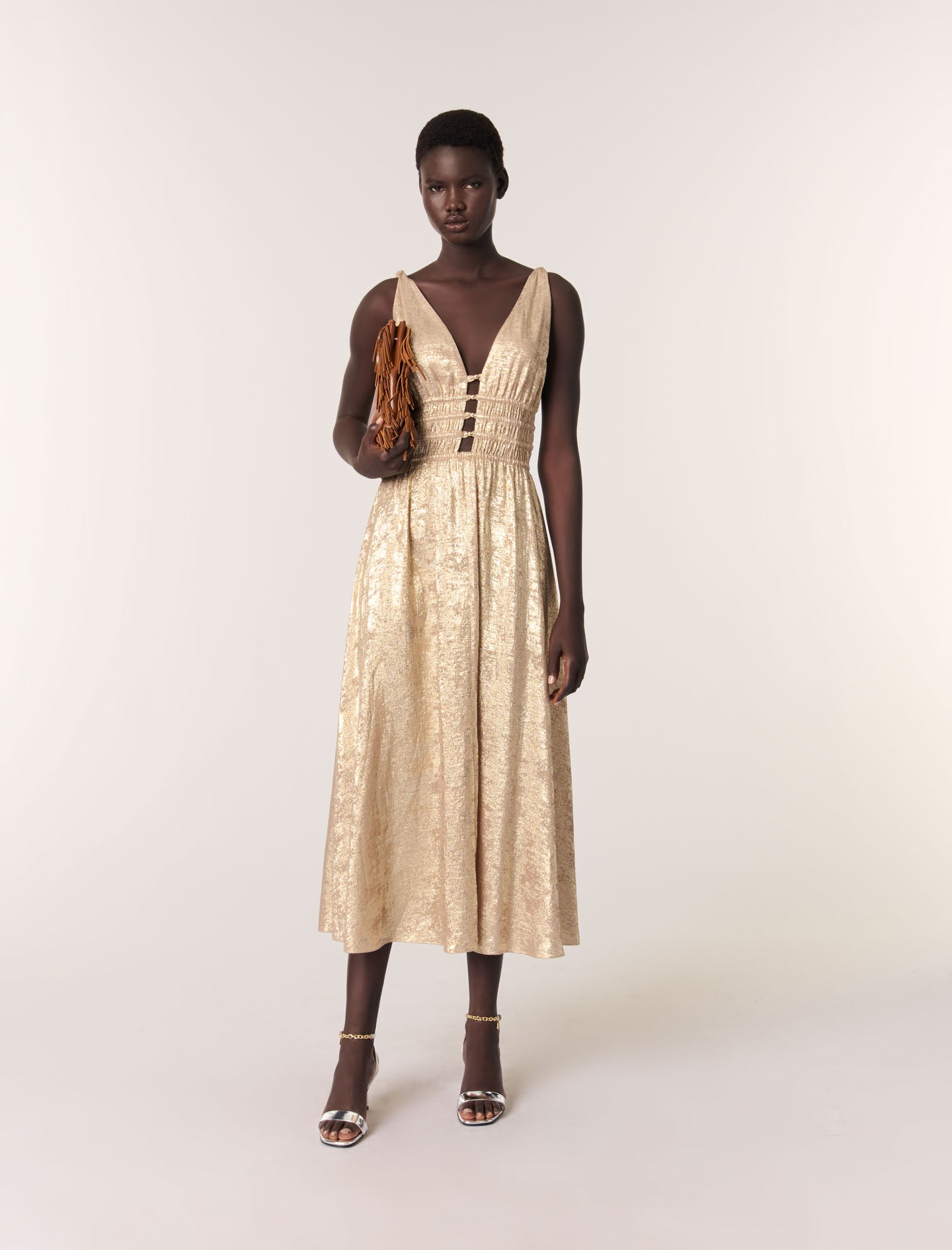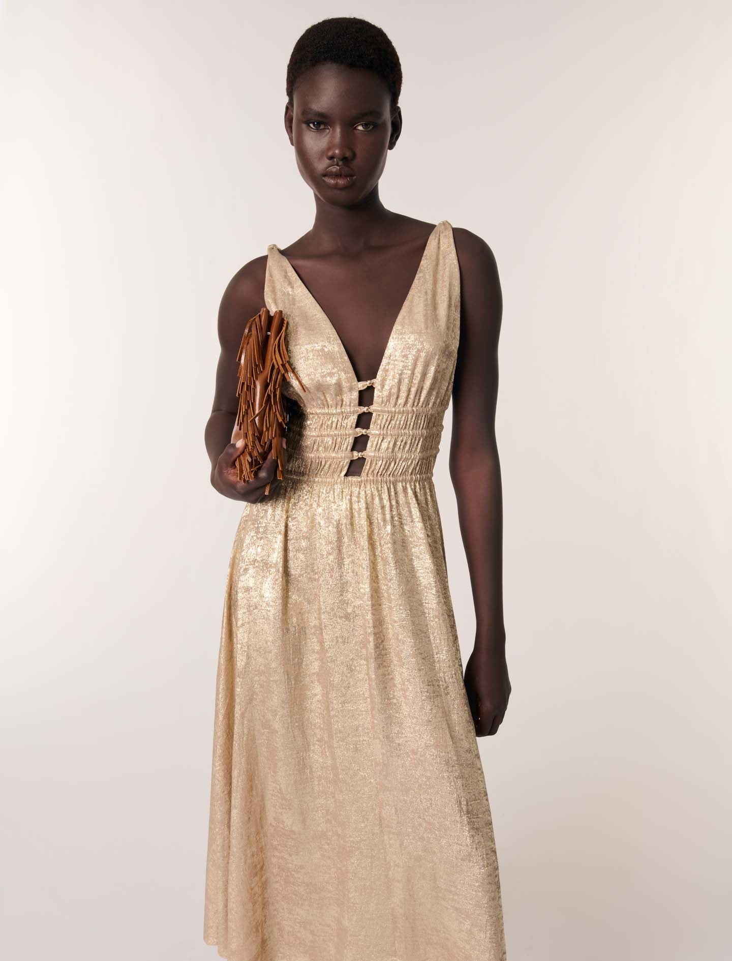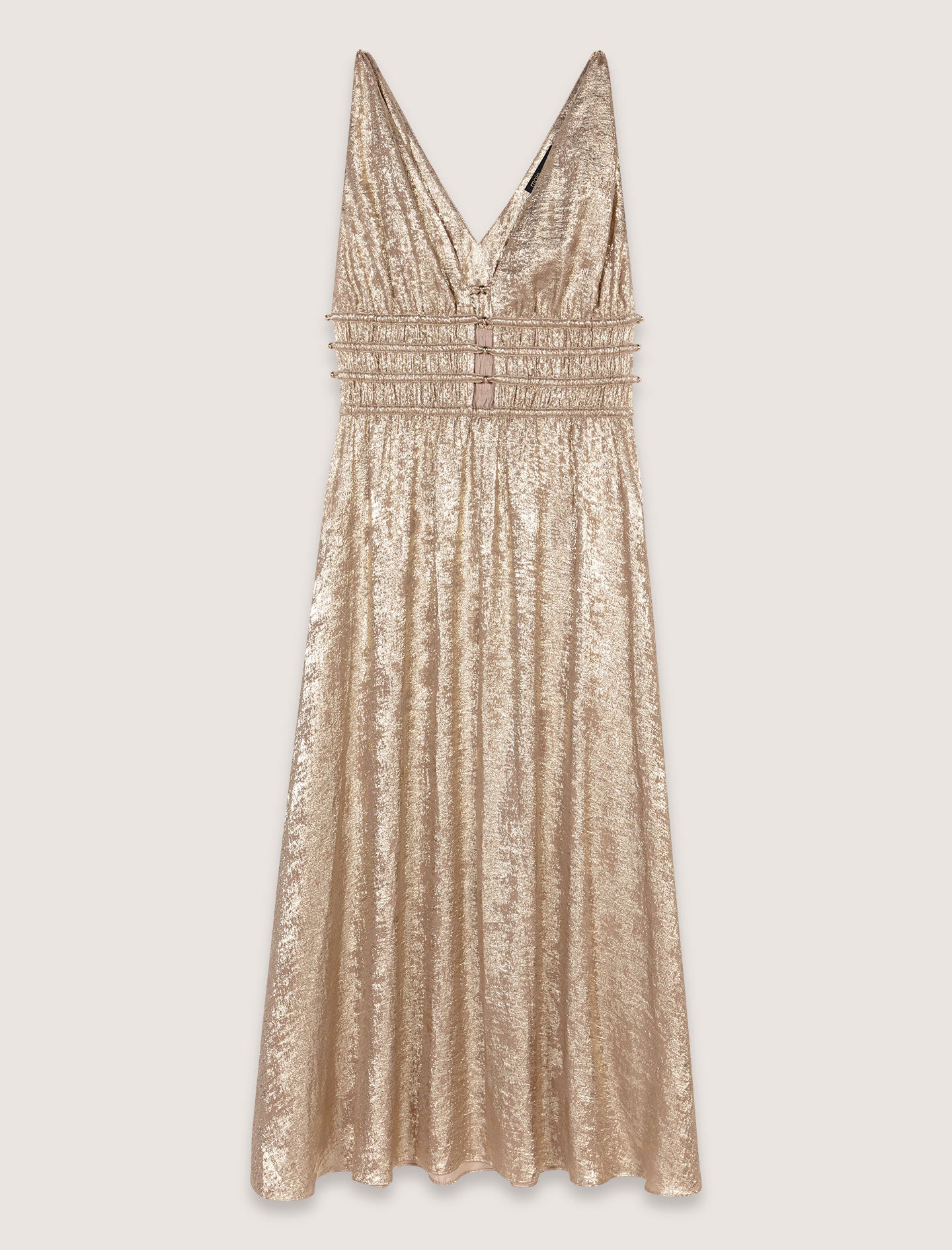 Un vestido largo perfecto para iluminar cualquier ocasión con su tejido brillante y dorado. Su escote de pico realza una falda fluida y acampanada. La cintura fruncida está realzada por recortes con cordones y cuentas doradas.